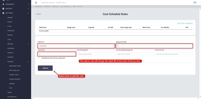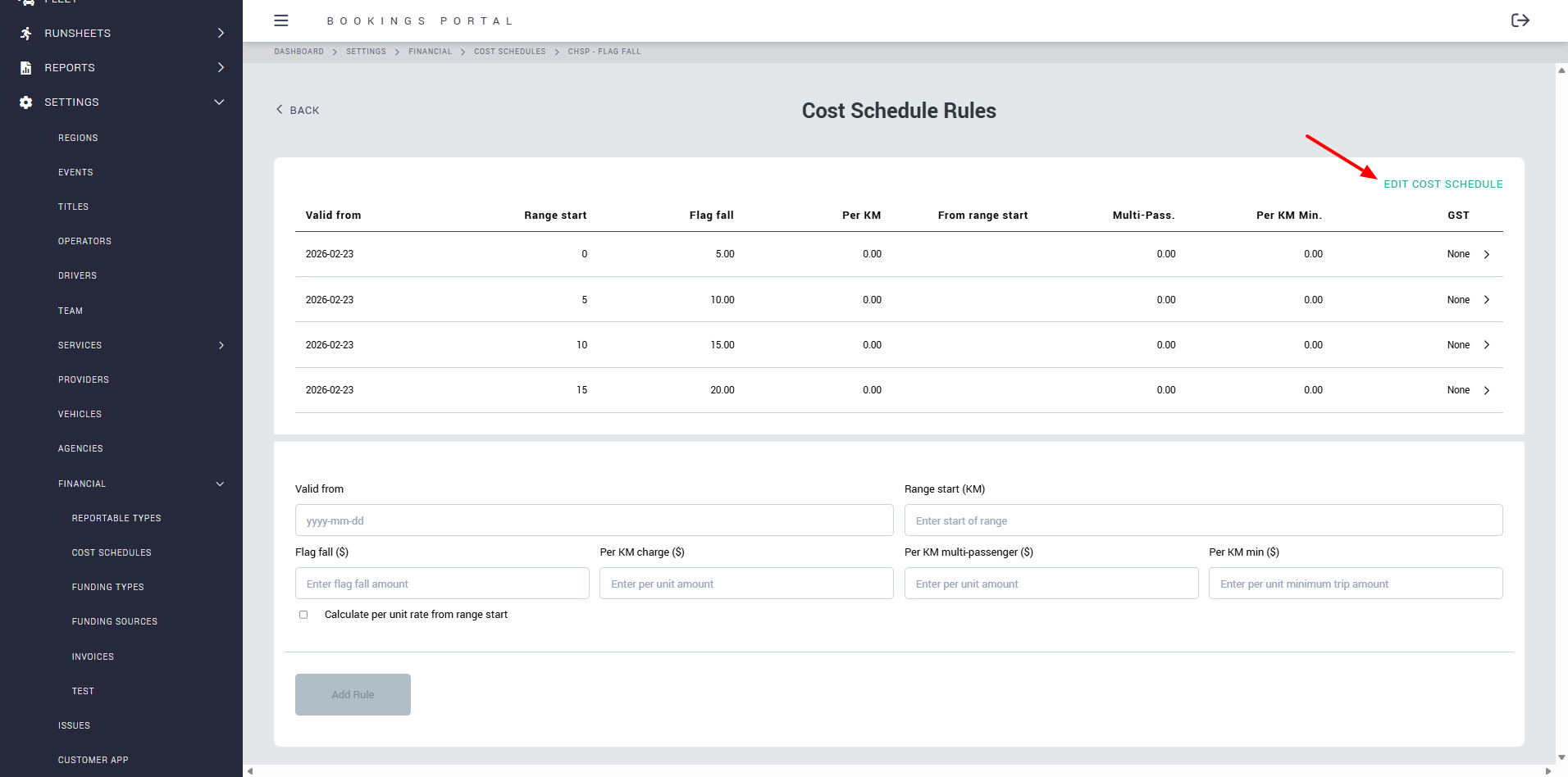 - Update Individual Rules: Click any rule in the table to open the Edit Cost Schedule Rule page and adjust the flag fall or per‑unit charges.