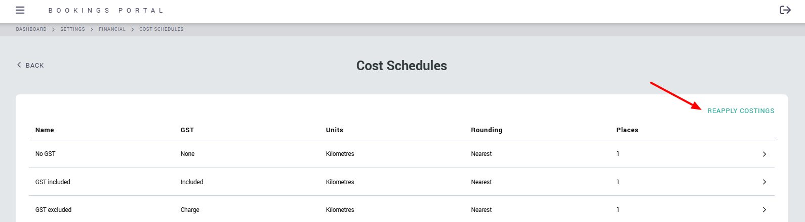 - Manual Batch Updates (Reapply Costings): To update a large set of existing bookings, use the REAPPLY COSTINGS link on the main Cost Schedules page.