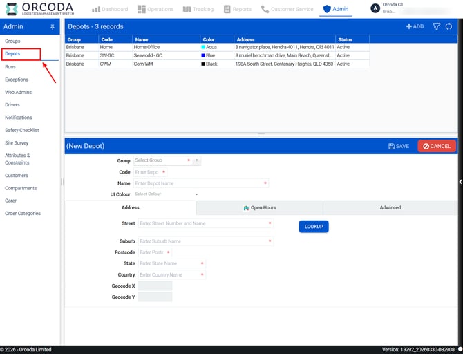 The Depots menu displays and creates depots for all regions. Users can add a depot using the Add button in the top right corner of the screen. From here you can update all the fields. These include: