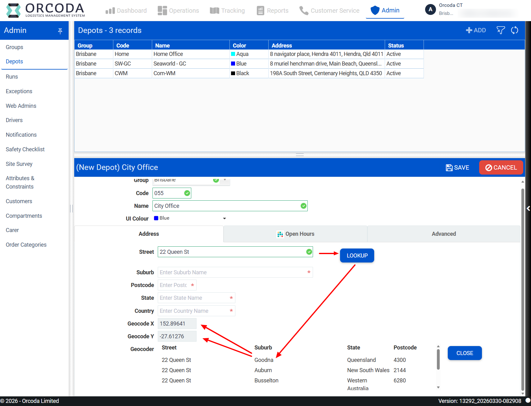When adding an address, you’ll need to geocode it to make sure the location is accurate. To do this, enter the depot’s street address and click **LOOKUP**. A list of address options will appear at the bottom of the page. Once you select the correct address, the **X** and **Y** coordinate fields will fill in automatically, and the depot will be successfully geocoded.