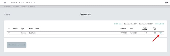 To open a finalised invoice, click VIEW on the line item on the Invoices page.