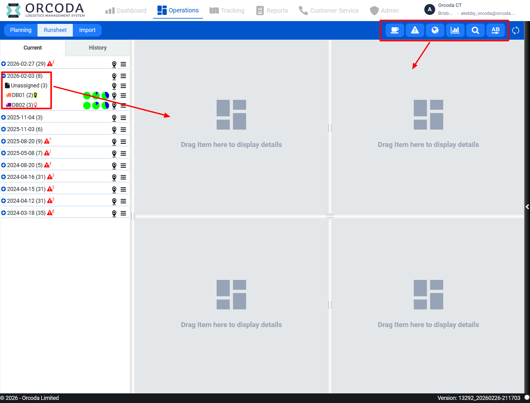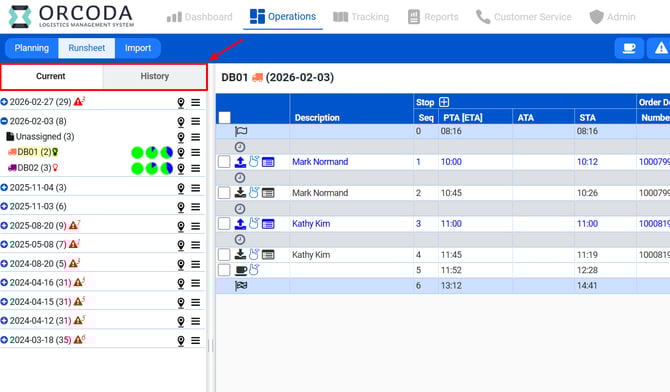 - Current: This tab displays runsheets for the current and future dates, which is the primary area for on-the-day dispatching.