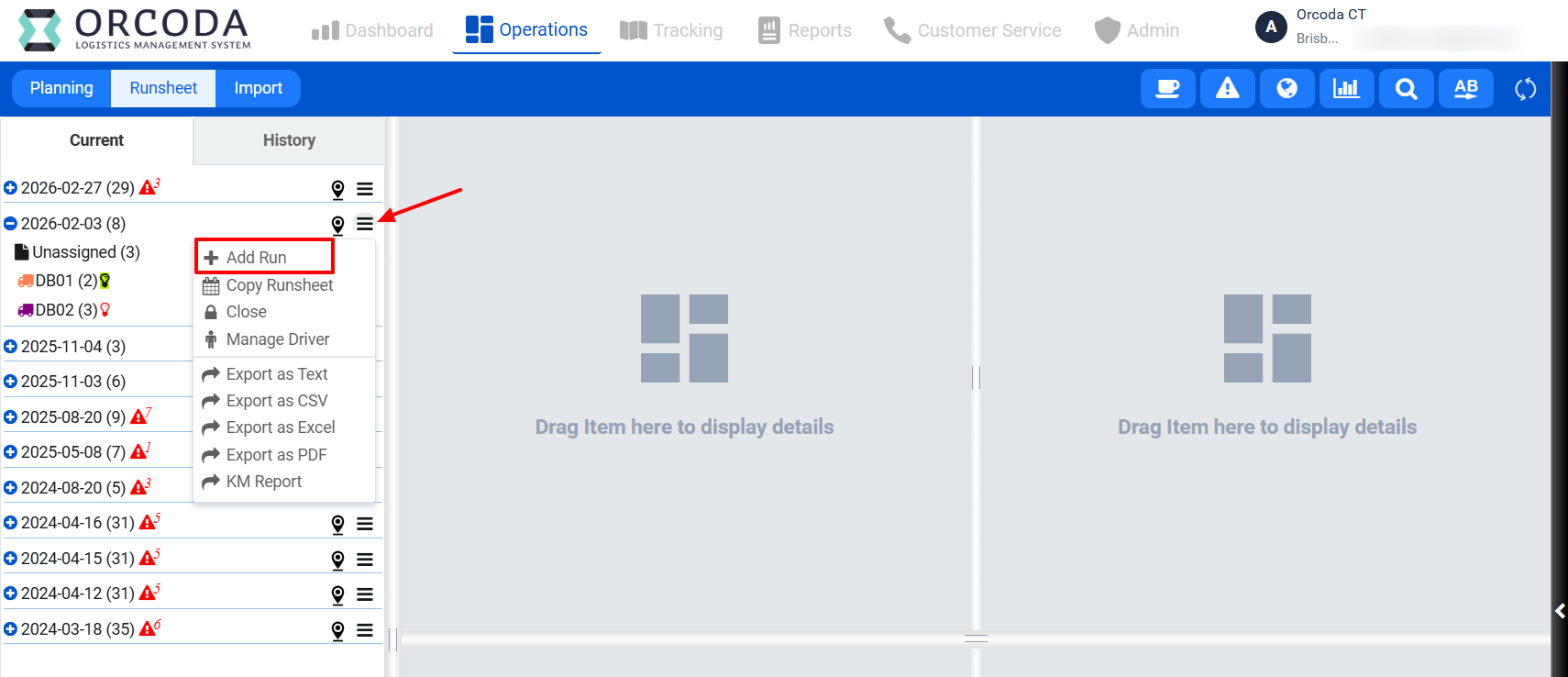 - Click the Save The selected runs will now appear under the runsheet date in the left-hand panel.