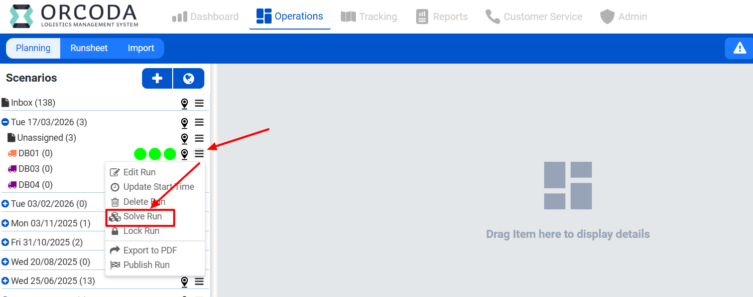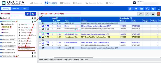 - Go Live: Clicking Publish moves the data to the official runsheet date, removes the scenario from your planning panel, and updates the order status for the drivers.
