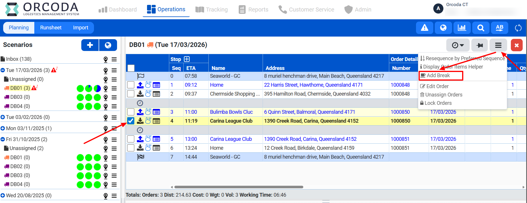 - Adding Breaks: You can manually add breaks within a run by selecting an order and clicking Actions → Add Break.