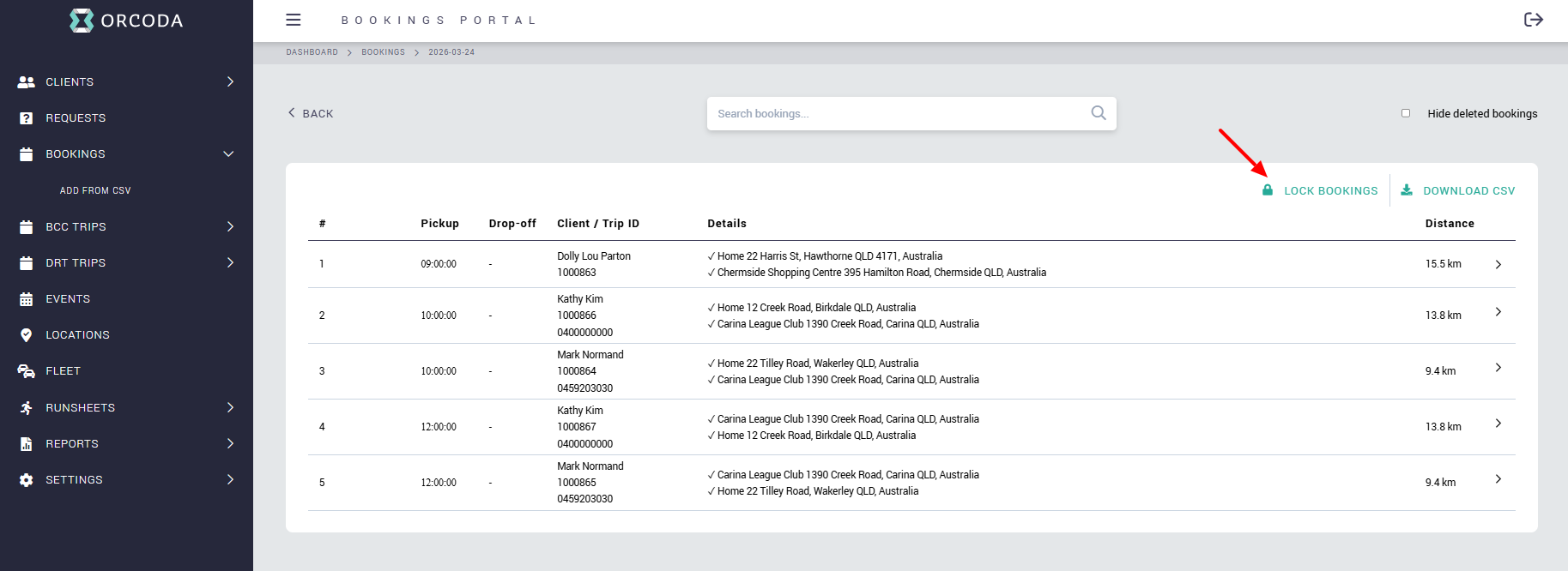 The first step in scheduling bookings, is to lock the day of bookings in OBS. Locking the bookings in OBS initiates the sync of bookings between OBS (Orcoda Booking System) and Transport 360.