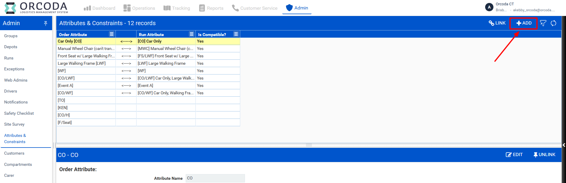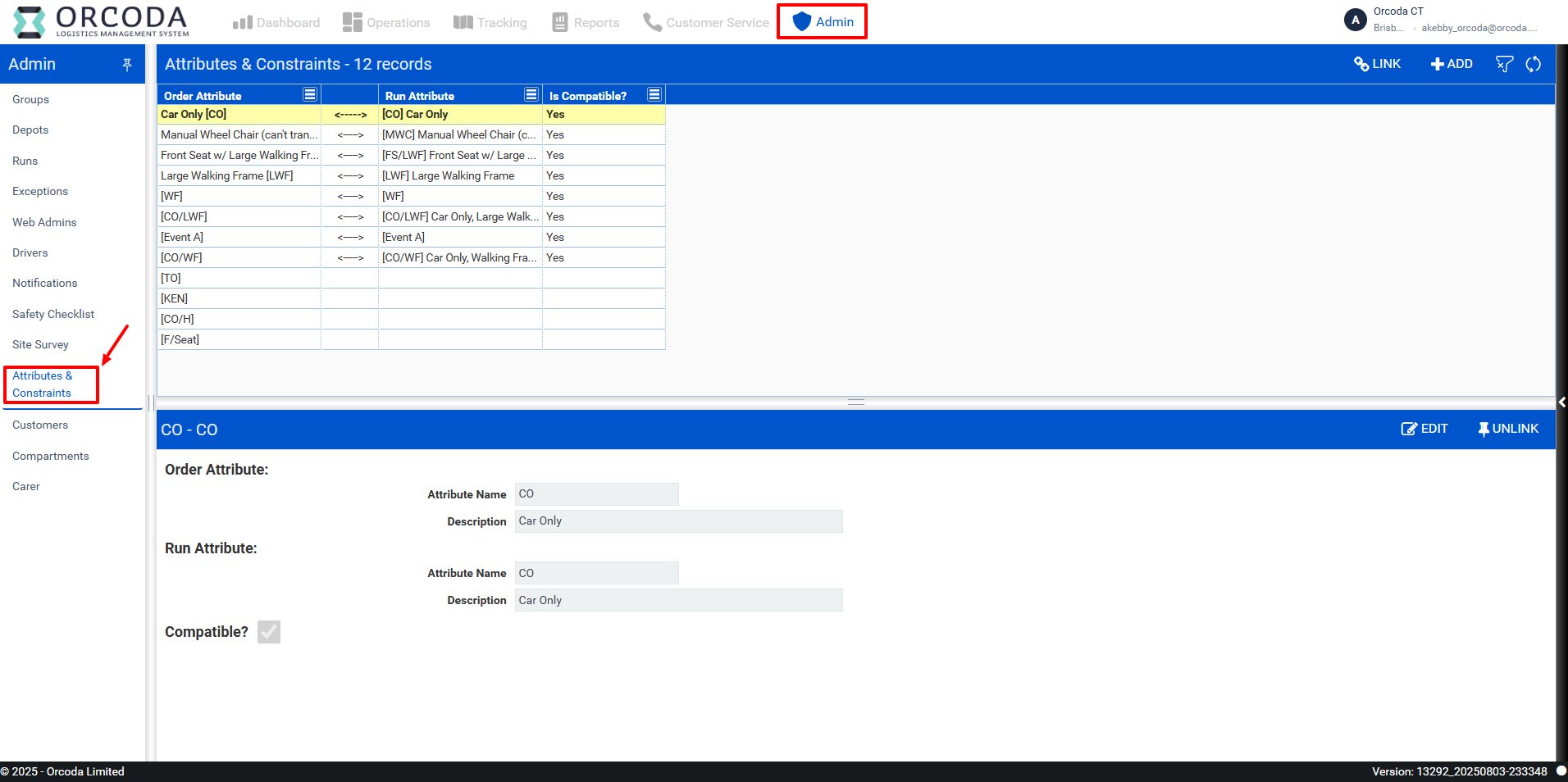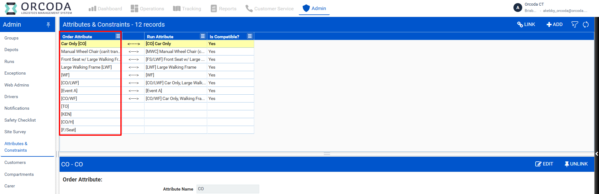 Attributes and Constraints can be linked up from the Admin page in Transport 360 as shown below: