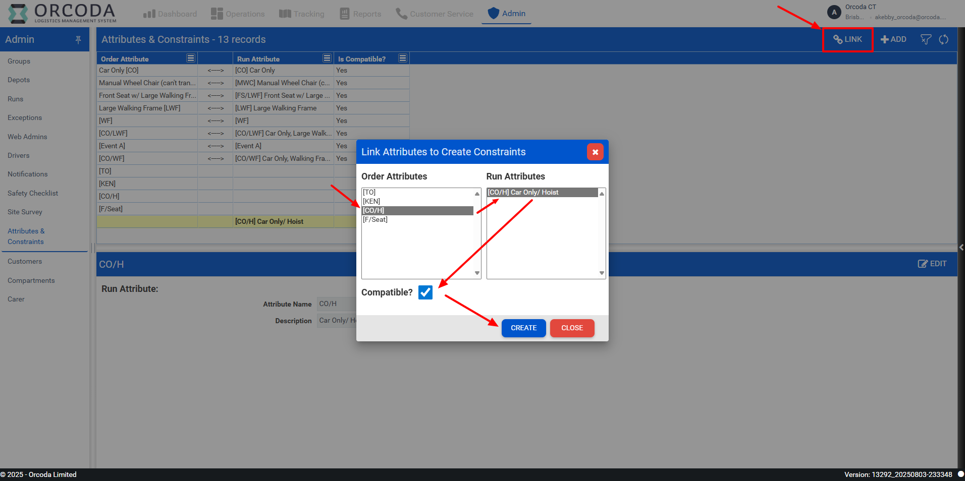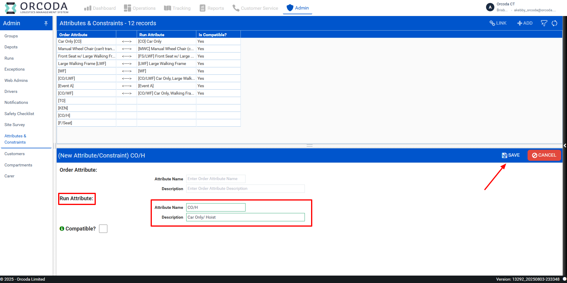To ensure these bookings are scheduled correctly, users must create a corresponding Run Attribute in OLMS and link it to the Order Attribute. Once linked, ticking the “Compatible” checkbox confirms that bookings with that attribute can be assigned to runs (vehicles) with the matching run attribute.